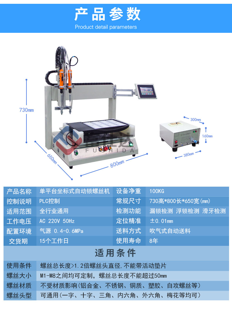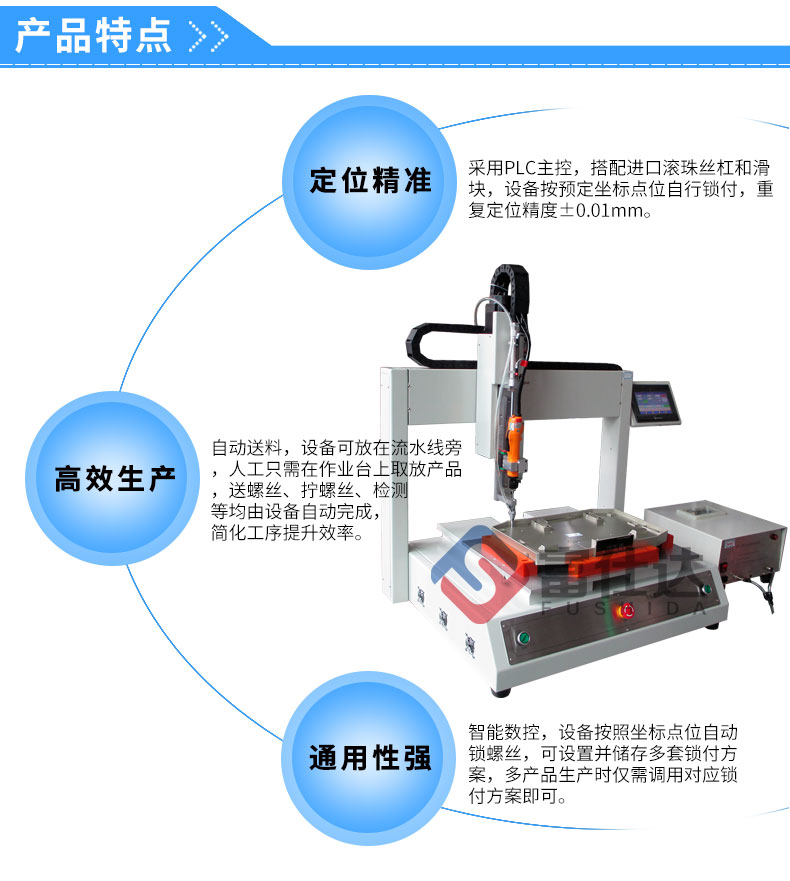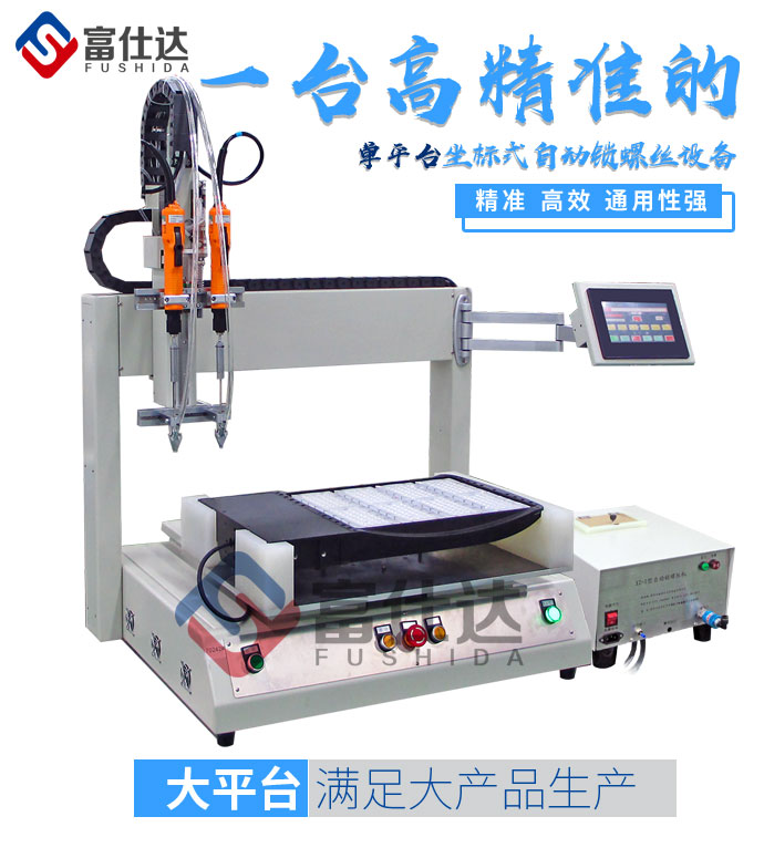 富仕達(dá)單平臺自動鎖螺絲機(jī)是指單平臺坐標(biāo)式自動鎖螺絲機(jī),通常用在面積較大產(chǎn)品,如:寫字板、大家電、天花吊頂、大型玩具及大型LED模組等。