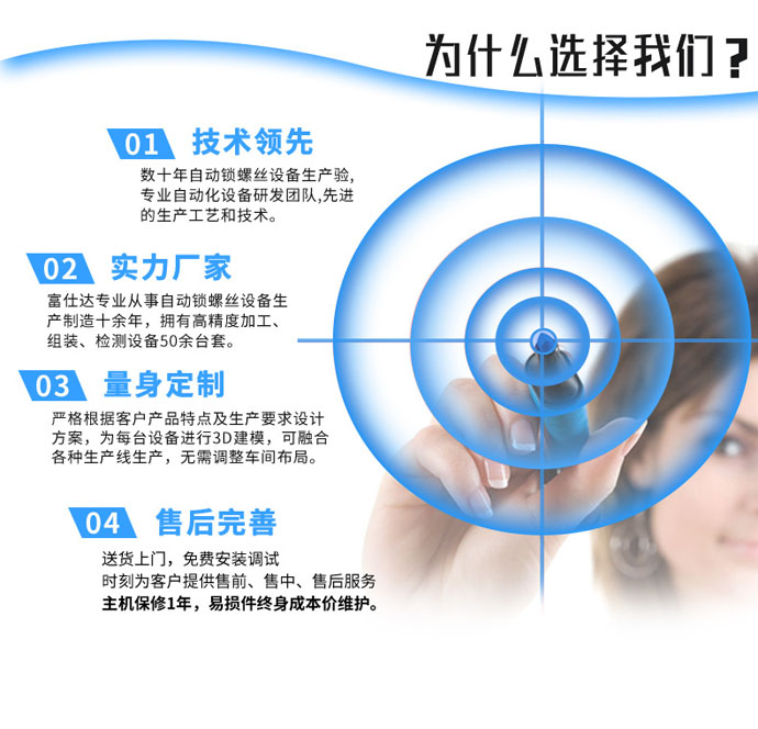 富仕達(dá)擁有獨(dú)立研發(fā)設(shè)計(jì)團(tuán)隊(duì),10多位自動化高級工程師,5000㎡自動鎖螺絲機(jī)生產(chǎn)、測試車間,專業(yè)售后服務(wù)團(tuán)隊(duì),為客戶提供方案設(shè)計(jì)、設(shè)備制造、操作培訓(xùn)、售后服務(wù)等一站式服務(wù)。 公司將持續(xù)提升技術(shù)創(chuàng)新和產(chǎn)品服務(wù)方面的優(yōu)勢,堅(jiān)持“專業(yè)、精工、服務(wù)”的企業(yè)理念,聚焦于自動鎖螺絲設(shè)備生產(chǎn),通過系統(tǒng)的一站式解決方案,真正的幫助客戶提升效率、降低成本,提升客戶的核心競爭力。